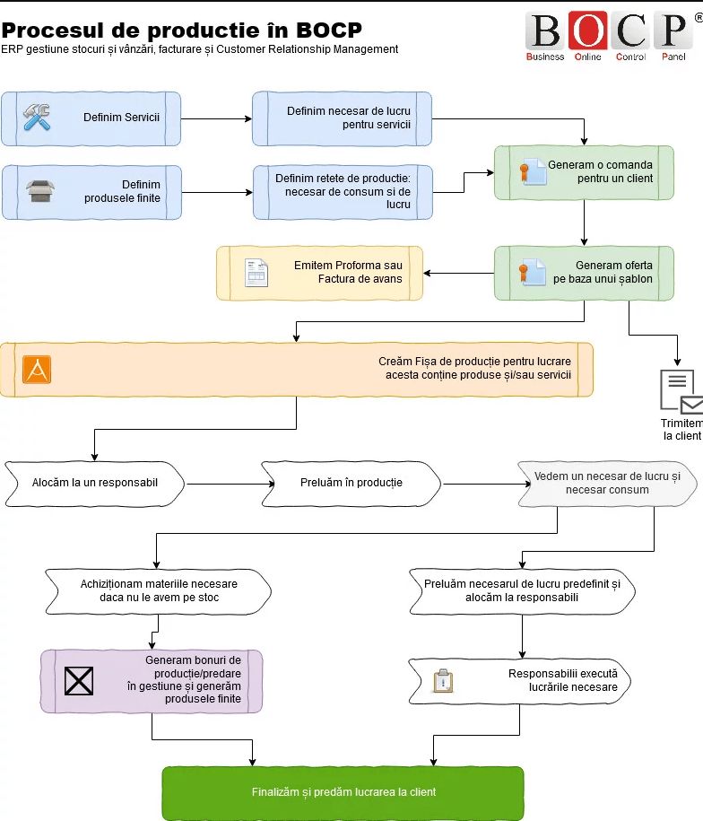 - predefinire taskuri de efectuat pentru servicii și produse finite